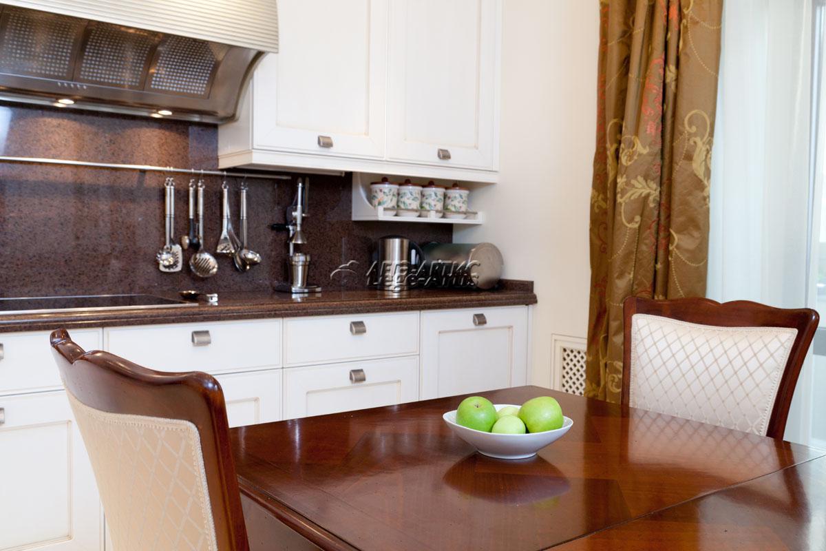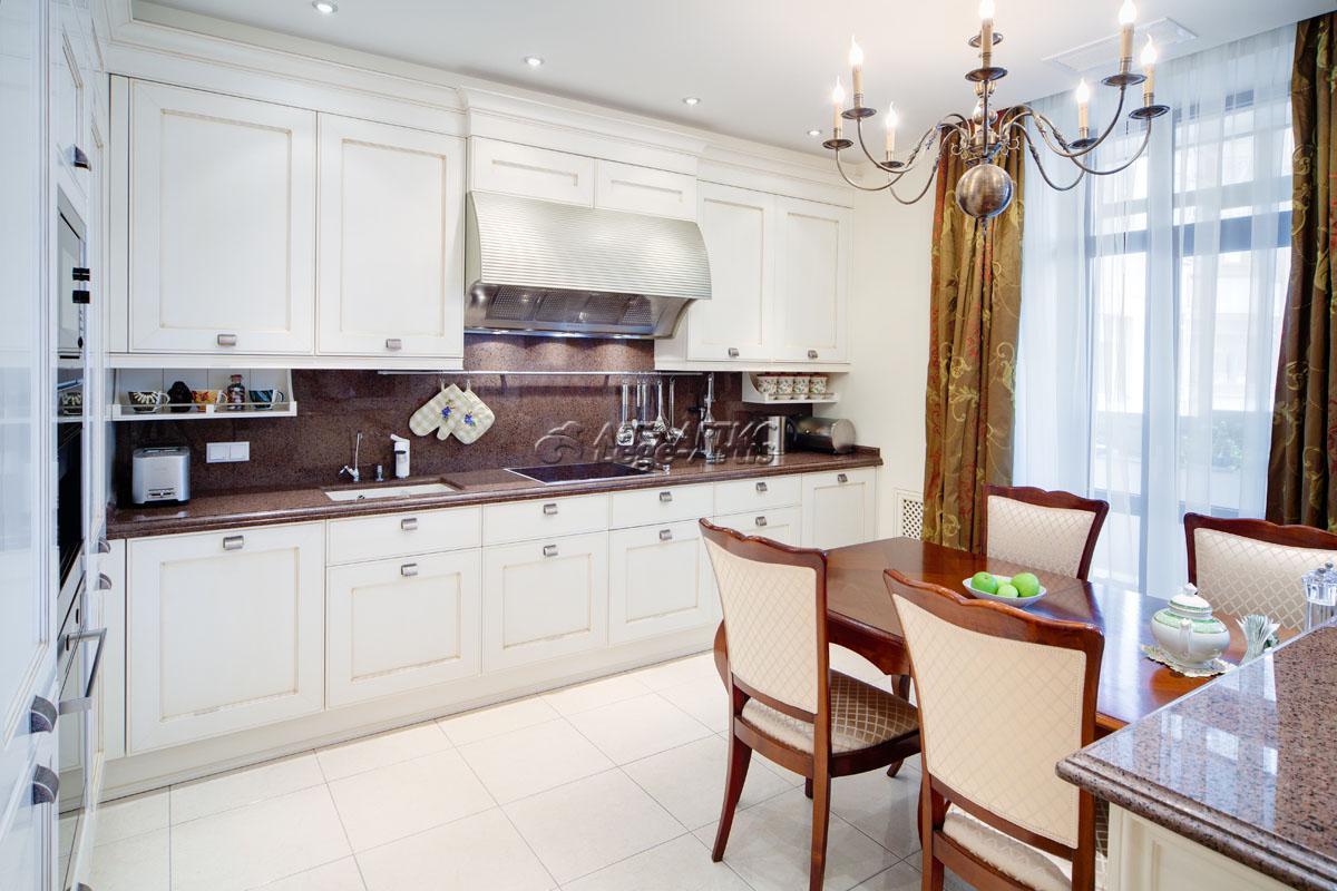 Первоначальная планировка не соответствовала требованиям заказчика, поэтому были внесены корректировки. Вместо гостевого санузла была сделана подсобно-постирочная комната, позволившая разместить в себе стиральную и сушильную машины, накопительный водонагреватель и полки для хозяйственных нужд и уборочного инвентаря. Кухня, гостиная и коридор сообщаются между собой без дверей и представляют из себя единое просторное помещение. Вся корпусная мебель и двери в квартире изготавливались индивидуально по эскизам архитектора. Системы хранения встроены в стены и закрыты дверцами с прозрачным остеклением. Вариант со встройкой мебели позволил избежать эффекта нагромождения отдельно стоящих предметов. Конфигурация подшивных потолков в квартире, на ряду с декоративной функцией, играет ещё и практическую роль. В запотолочном пространстве размещены трассы воздуховодов канального кондиционирования.